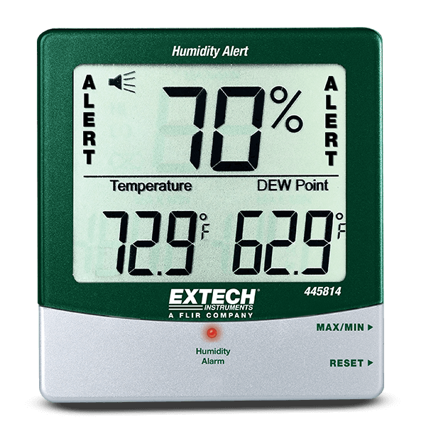 The Extech 445814 Humidity Alert Hygro-Thermometer has a programmable % RH audible and visual alarm that alerts you when humidity exceeds the set limit. A large LCD simultaneously displays temperature, humidity, and dew point. This product measures humidity from 10% RH to 99% RH ± 4% RH and temperature from -10°C to 60°C ± 1°C (14°F to 140°F ± 1.8°F). Rear calibration pot for humidity and temperature. Featuring maximum/minimum with reset functions that store and recall the highest and lowest readings recorded. Comes complete with built-in stand, wall bracket and one AAA battery.