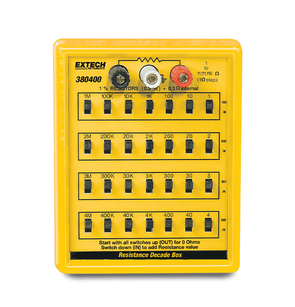 The Extech 380400 Resistance Decade Box is very popular for product design testing and calibration because it can be substituted into a circuit and function in the place of any component with a standard value easily. Alternatively, it can be used to identify the best value for circuit operation then read that value from the switches. Then, a resistor of the size indicated by the decade box switches can be put into the circuit.