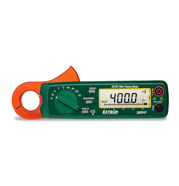 The compact Extech 380941 is a 200 Amp mini AC/DC clamp meter with a small diameter jaw designed to reach in small areas while providing 10mA resolution (DC) and very low-current sensitivity. This mini clamp meter is useful for troubleshooting tasks in plant maintenance, electrical, HVAC, and telecom work, as well as home electrical, fleet maintenance, marine, and motorcycle repairs. The 380941 has a CAT III 300-Volt safety rating and a one year warranty. Comes with batteries and manual.