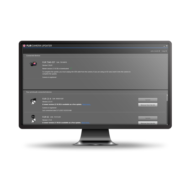 FLIR Camera Updater will automatically notify you when an update is available for the following FLIR thermal cameras*: T420, T420bx, T440, T440bx, T450sc, T460, E30, E33, E40, E40bx, E50, E60, E60bx, E63, E65, E4, E5-XT, E6-XT, E8-XT, ETS320, C3, C5, C3-X, E76, E86, E96, E54, E52, E75, E85, E95, T530, T540, T560, T560-EST, T840, T860, T640, T640bx, T650sc, T660, T620, T620bx, T865, T1020, and T1040.