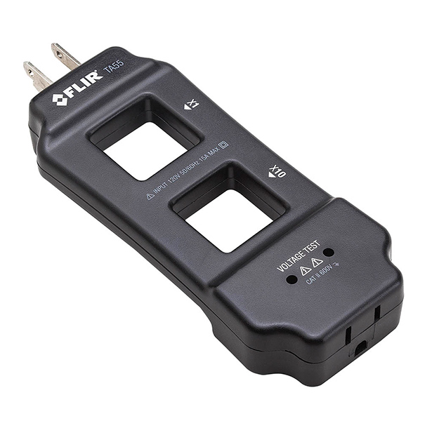 Provides easy and safe measurements of current and voltage from two or three wire outlets. Plugging the power connector into the line splitter separates the hot/live conductor from the neutral (and ground) for accurate current measurement. Dual ranges (x1 and x10) for higher resolution on low-amperage readings. Built-in recessed voltage testing inputs.